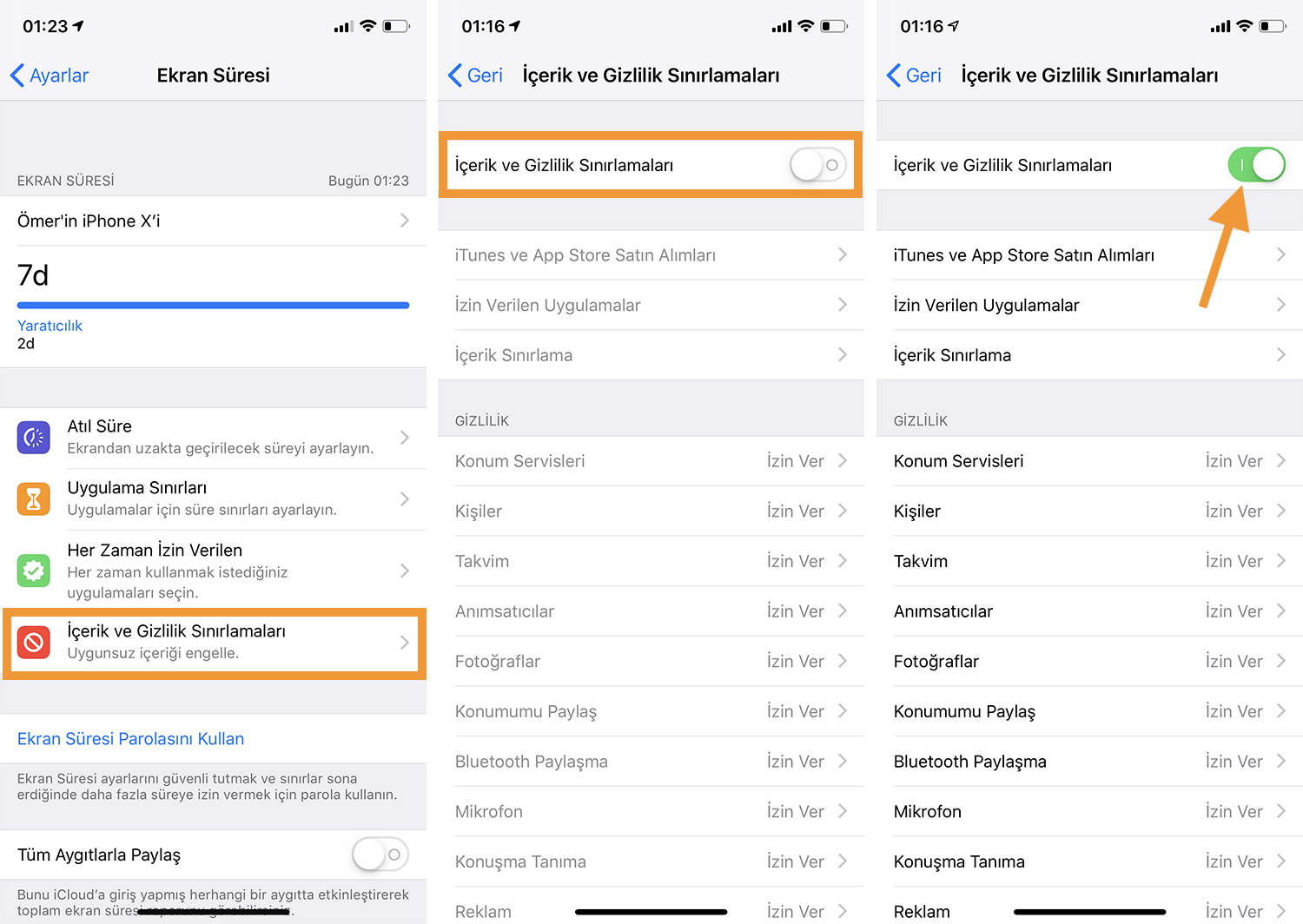 Öncelikle Ekran Süresi özelliği kapalı ise etkinleştirin. Zaten açıksa Ekran Süresi > İçerik ve Gizlilik Sınırlamaları menüsüne gidin. İçerik ve Gizlilik Sınırlamaları seçeneğinin yanındaki anahtarı açın.