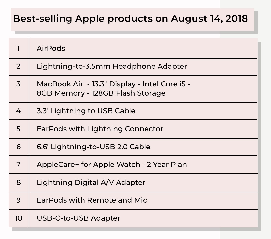3.5 mm kulaklık jakı dışında Best Buy’da diğer en çok satan Apple markalı cihazlar, hizmetler ve aksesuarların listesi ise aşağıdaki gibi.
