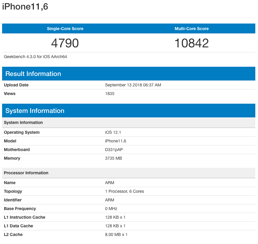 İlk testte “iPhone11,6” model tanımlayıcısı ile iPhone Xs’in tek çekirdek ve çoklu çekirdek performans bilgileri yer alıyor. Yeni iPhone’un tek çekirdek performans skoru 4790 ve çok çekirdek performans skoru 10842.
