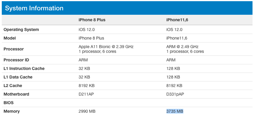 Doğruluğu sorgulanabilir bir Geekbench performans testine göre, model tanımlayıcısı “iPhone 11,6” olan iPhone Xs’de 4 GB RAM bulunuyor. iPhone XS Max’teki bellek miktarı da 4 GB. iPhone XR’deki bellek miktarı ise iPhone X ile aynı, yani 3 GB.