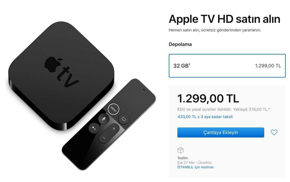 Apple, 4K içeriğe ihtiyaç duymayanlar için 4. nesil Apple TV’nin satışını devam ettiriyor. Apple TV 4K’nın 32 GB depolama seçeneği ile sunulan modelinin fiyatı 1.579 TL. Apple TV HD’nin 32 GB depolama seçeneği ile sunulan modelinin fiyatı ise 1.299 TL.