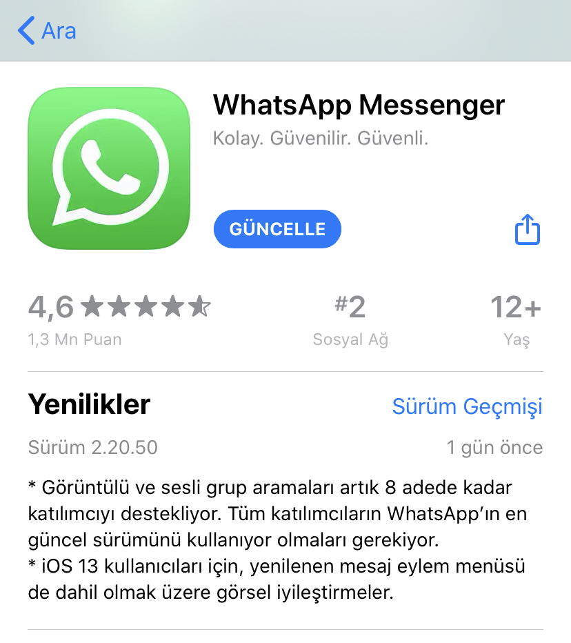 Yayınlanan yeni güncelleme, WhatsApp’ı FaceTime’a karşı bir nebze daha kullanılabilir yaptı. FaceTime 32 kişiye kadar görüntülü konuşma imkanı sunsa da WhatsApp kadar yaygın kullanılan bir platform değil. Yayınlanan güncelleme ile beraber iyileştirilmeler de yapıldı. iPhone’larında iOS 13 yüklü kullanıcılar için menüler ve bazı görsellerde iyileştirilmeler yapıldı.