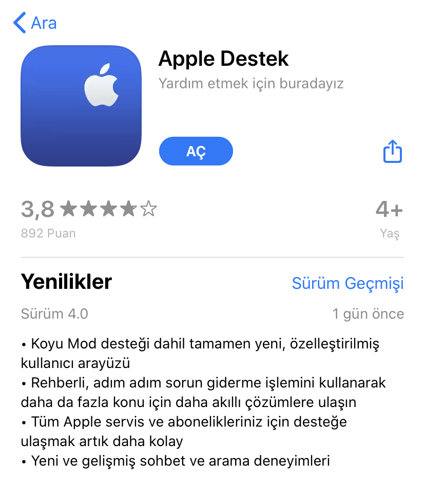 Apple Destek güncellendi