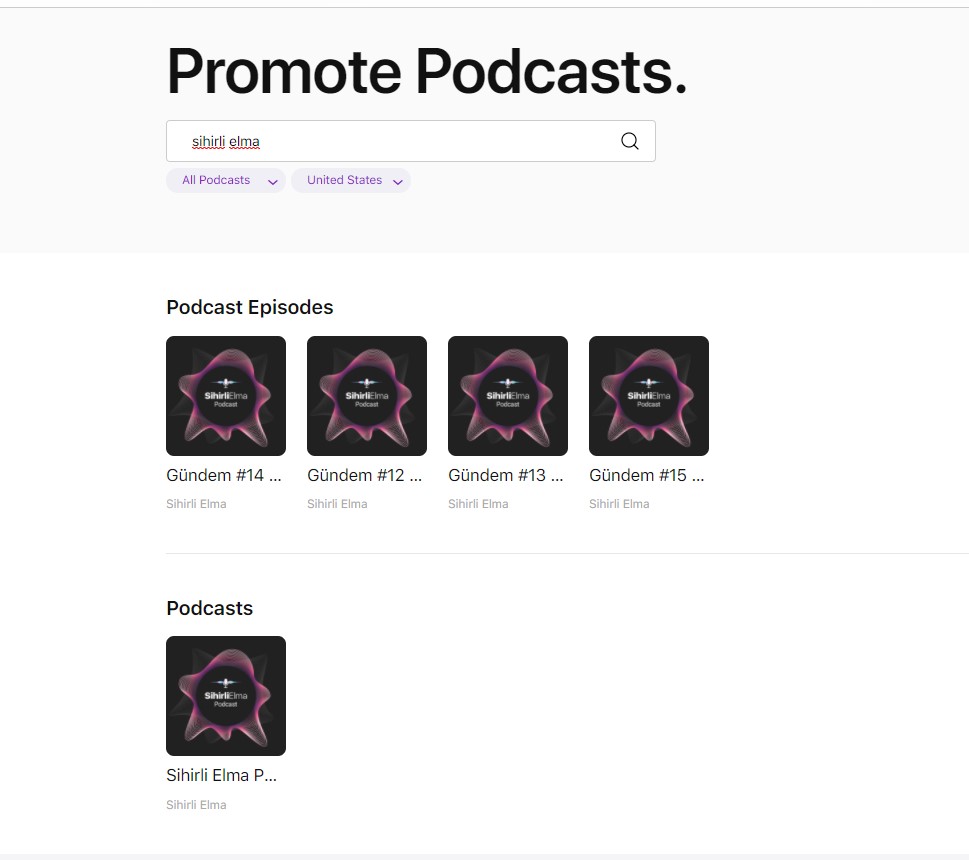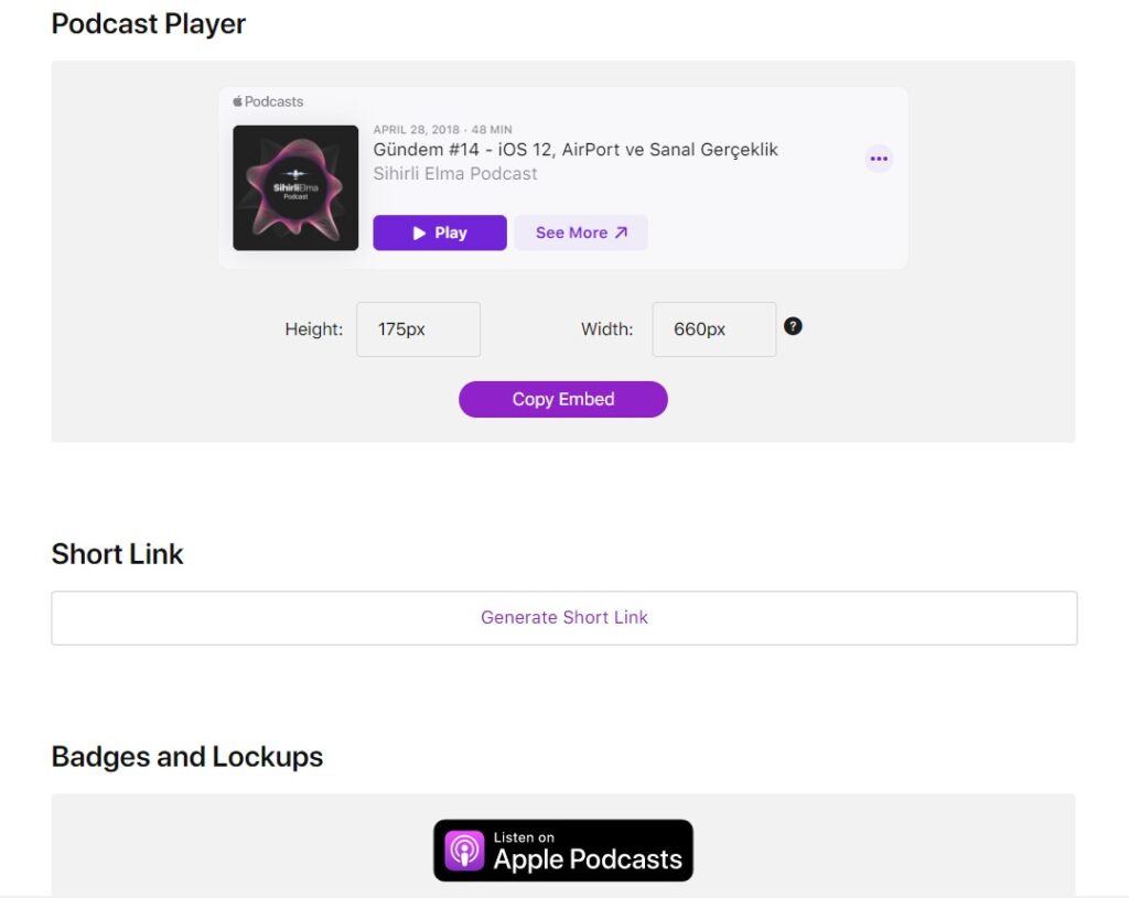 Apple Podcasts Marketing Tools sayfasında yer alan arama çubuğu üzerinden istediğiniz Podcast kaydını aratabilir, aradığınız Podcast üreticisinin tüm kayıtlarına ulaşabilirsiniz. Seçtiğiniz herhangi bir Podcast kaydının HTML kodunu sitenize ekleyebilir, kullanıcılara link verebilmek için link kısaltabilir, Podcast erişimi için QR kod oluşturabilirsiniz.