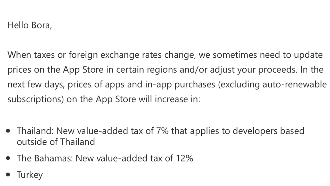 Kısa süre önce Apple tarafından Türk bir müşteriye atılan e-posta, şirketin planlarını ortaya çıkardı. Teknoloji devi tarafından gönderilen bildiride, “Merhaba Bora, İş yaptığımız pazarlardaki vergiler ya da kur oranlarını değiştiğinde, fiyatlarımızı güncellememiz gerekiyor. Önümüzdeki günlerde aşağıda belirtilen bölgelerdeki App Store fiyatları (Abonelik servisleri dahil) artacak.”