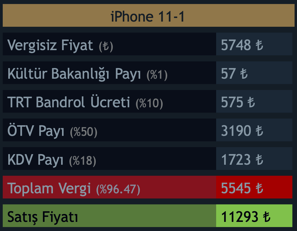 Hesapladığımız telefonlar arasında yer alan iPhone 11, ABD’de 499 dolar fiyat etiketine sahip. iPhone 11’in ülkemizdeki resmi satış fiyatının dolar karşılığı ise 479 dolar. Bu tutarı, 1 doları 12 TL (25 Kasım dolar kuru) olarak düşünürsek, aşağıda da görebileceğiniz tüm vergiler eklendiğinde 11.293 TL tutuyor.