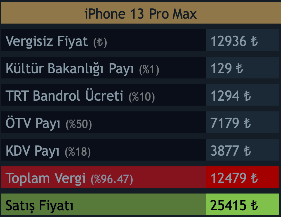 Son olarak 40 bin TL fiyatı olması birçok insan tarafından beklenen ancak olmayan iPhone 13 Pro Max, ABD’de 1.099 dolara satılıyor. Ülkemizdeki fiyatın dolar karşılığı ise 1.078 dolar tutuyor. Aynı şekilde güncel kura çevirip vergileri eklediğimizde ise karşımıza 25.415 TL yeni satış fiyatı çıkıyor