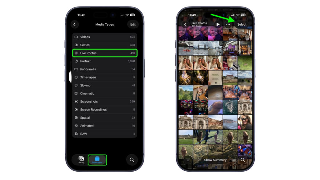Albüm sayfasında aşağıya doğru inerek “Medya Türleri” bölümünü bulun ve buradan “Live Photos” seçeneğine tıklayın. Sağ üst köşede yer alan “Seç” butonuna basarak videoya dahil etmek istediğiniz tüm hareketli fotoğrafları tek tek işaretleyin. Seçtiğiniz her görselin üzerinde mavi bir onay işareti belirecektir.