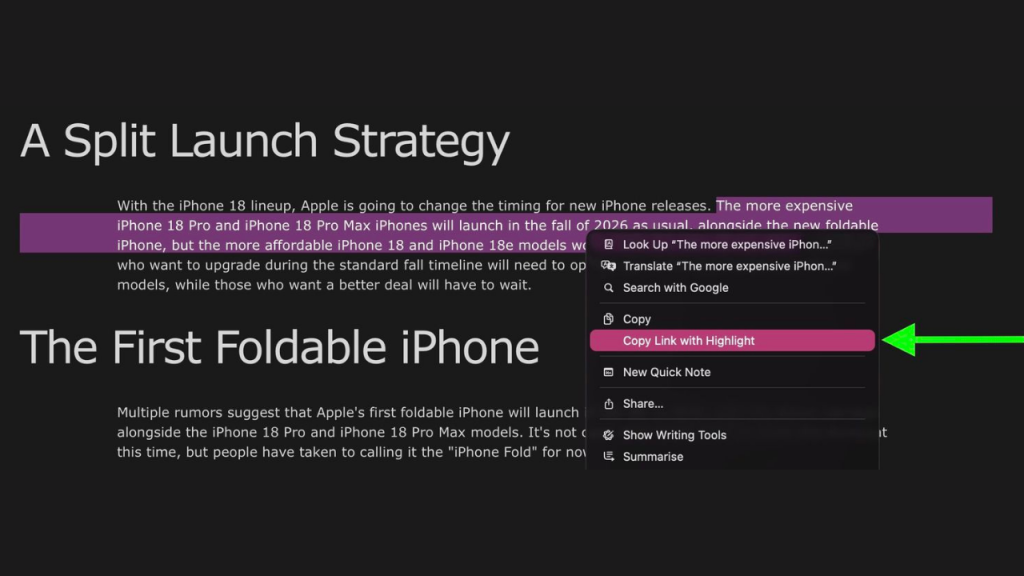 Bu özelliği kullanmak için Mac cihazınızda Safari tarayıcısını açın. Paylaşmak istediğiniz metni farenizle seçin. Ardından sağ tıklayarak açılan menüden “Vurguyla Bağlantıyı Kopyala” seçeneğine tıklayın. Bu işlem, seçtiğiniz metni hedef alan özel bir URL oluşturur.
