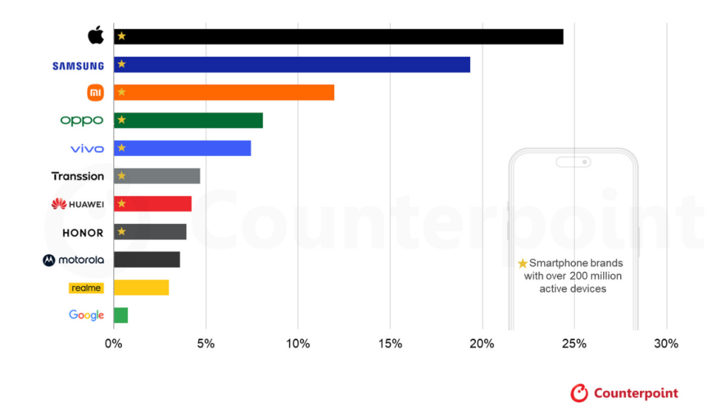 iPhone kullanım oranı, Counterpoint Research tarafından yayımlanan yeni verilere göre dünya genelinde her dört aktif akıllı telefondan birinin artık bir iPhone olduğunu gösteriyor.